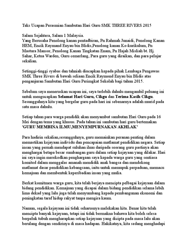 Contoh Teks Ucapan Perasmian Sambutan Hari Guru Smk Three Rivers 2015 Pdf